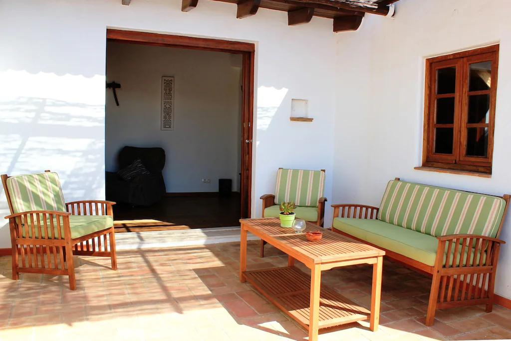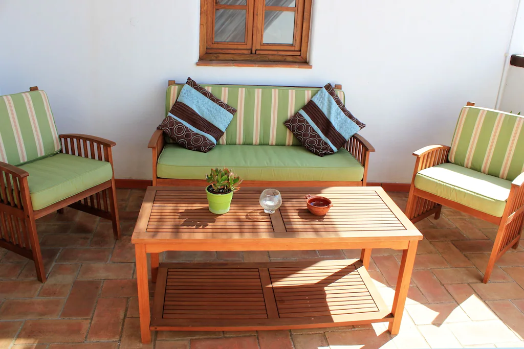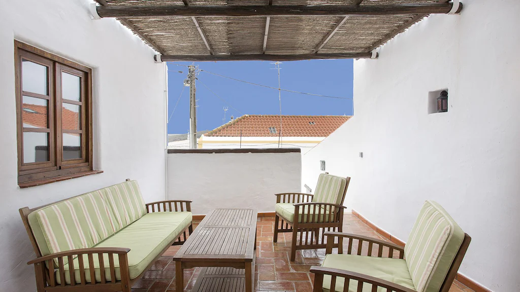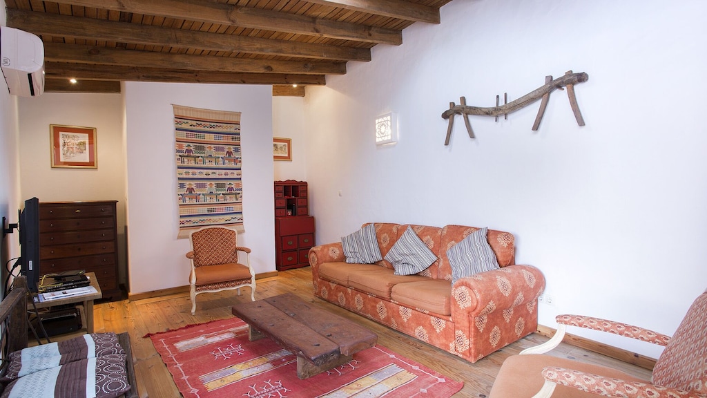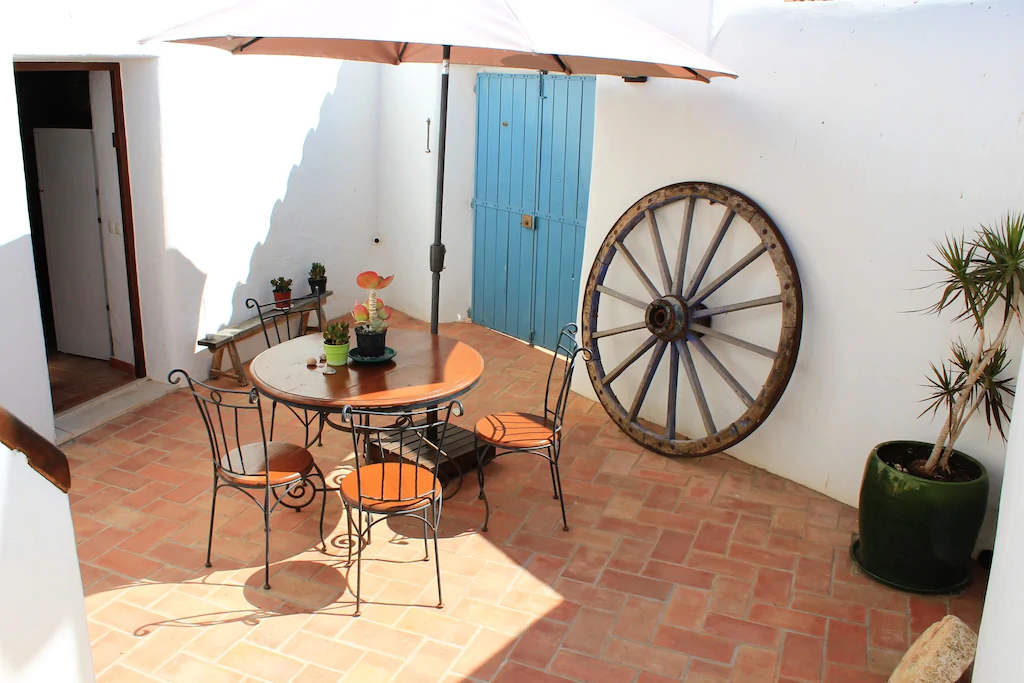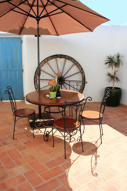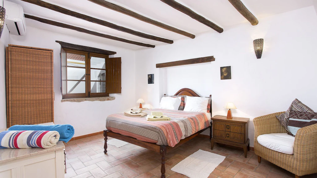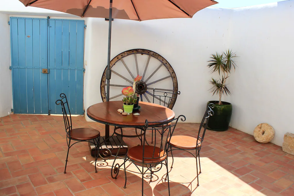 This beautifully converted barn in Figueira, completed in 2010, which provides all modern comforts while retaining its old world charm and character. Much use has been made of the wooden beams that formed part of the original building. The house is located on a quiet street with wooden doors which open onto a walled area, providing complete privacy. This downstairs patio is equipped with charcoal barbecue, table and chairs and umbrella. A stable type door leads to a spacious kitchen diner, with a small sitting area at the far end. The kitchen is well equipped and has washing machine, dishwasher, microwave, and fridge freezer. There is air conditioning in the kitchen, to provide heating in the winter months and cooling in the summer. The two bedrooms and bathroom are also on this floor, the master bedroom has air-conditioning. A staircase from the kitchen leads to a good sized air conditioned living room on the first floor, with seating for five, satellite TV and Portuguese internet TV, fibre and a DVD player. Large sliding doors lead out to a shaded terrace with chairs and table.