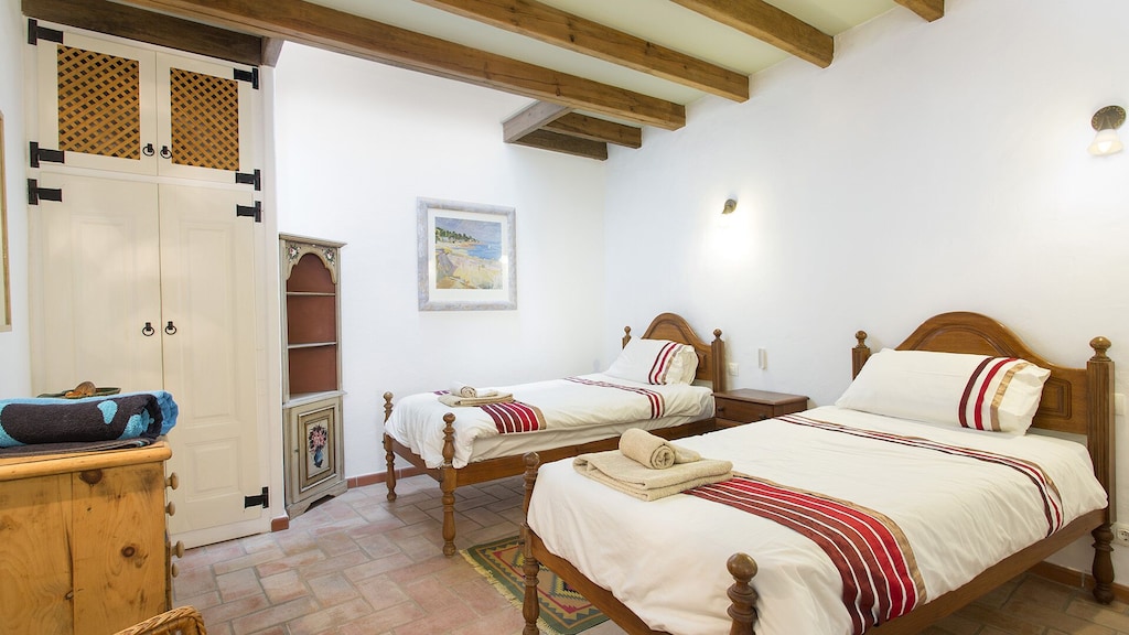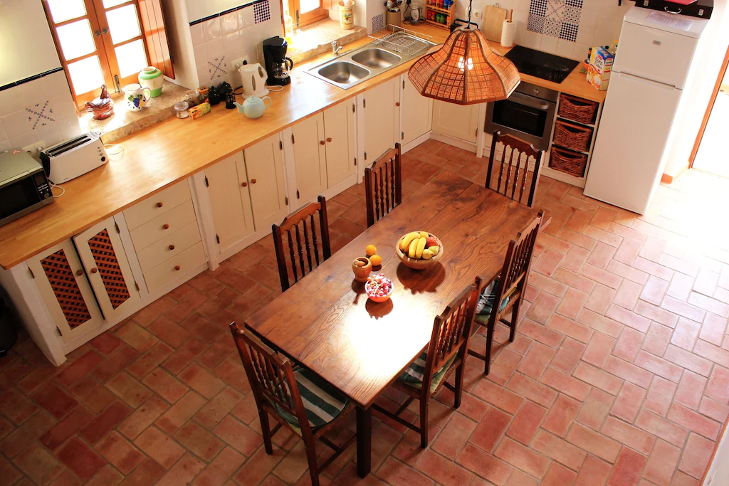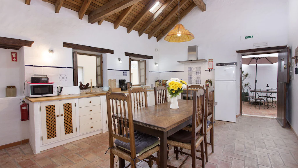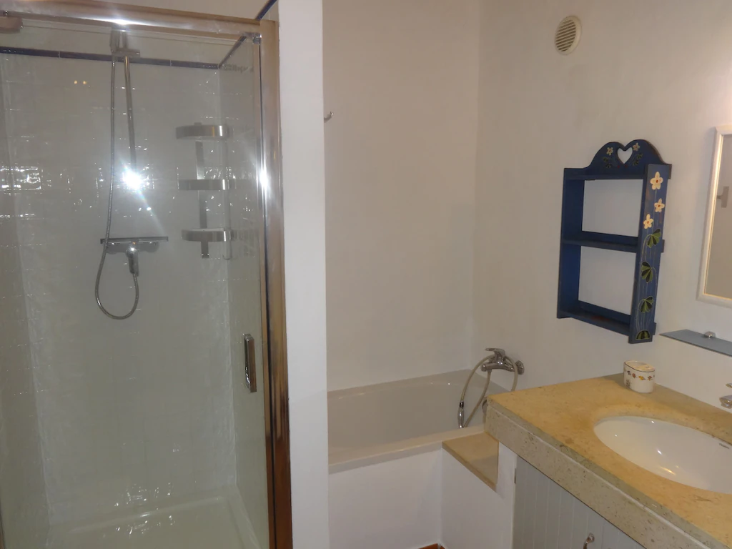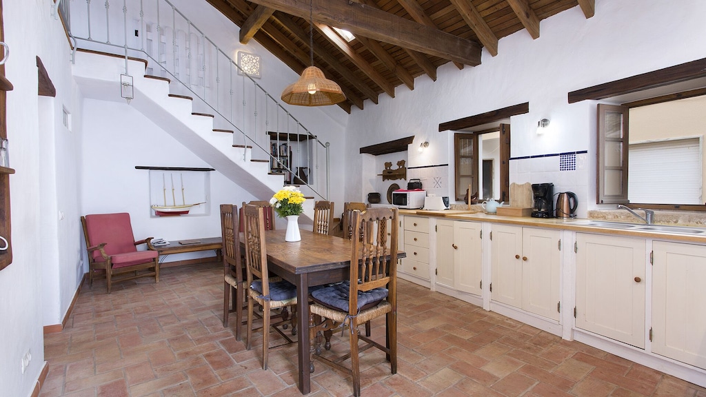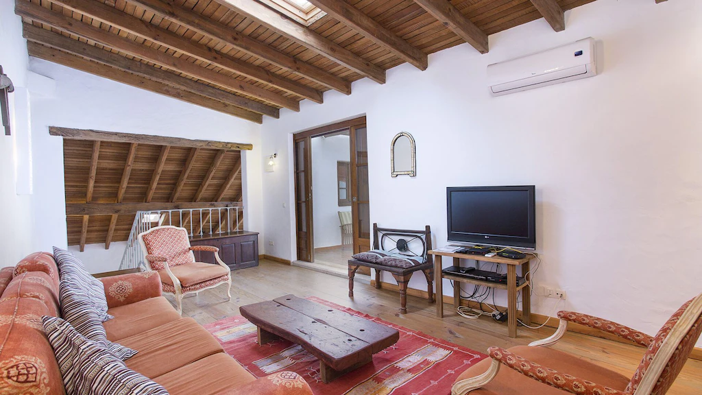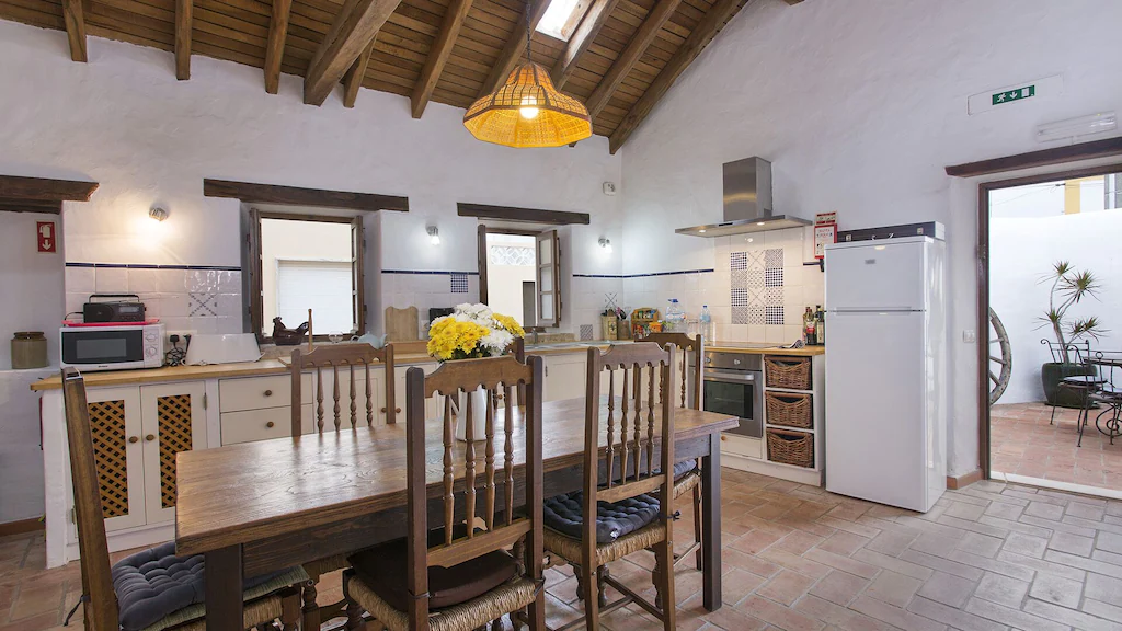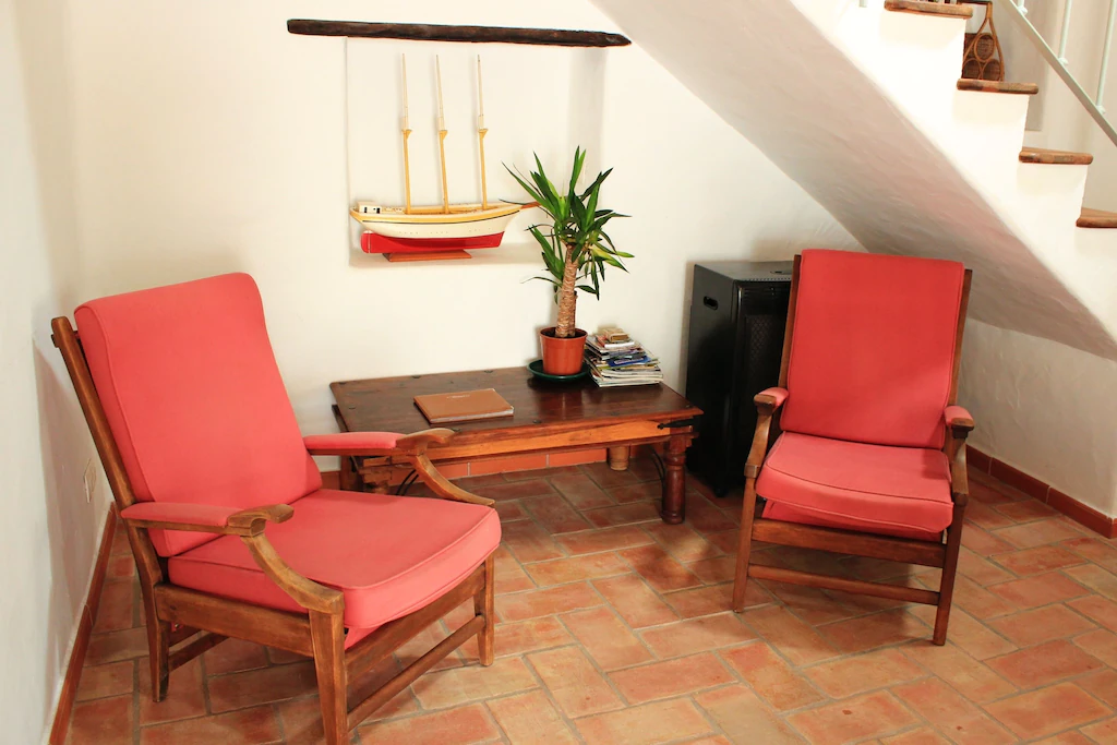 This beautifully converted barn in Figueira, completed in 2010, which provides all modern comforts while retaining its old world charm and character. Much use has been made of the wooden beams that formed part of the original building. The house is located on a quiet street with wooden doors which open onto a walled area, providing complete privacy. This downstairs patio is equipped with charcoal barbecue, table and chairs and umbrella. A stable type door leads to a spacious kitchen diner, with a small sitting area at the far end. The kitchen is well equipped and has washing machine, dishwasher, microwave, and fridge freezer. There is air conditioning in the kitchen, to provide heating in the winter months and cooling in the summer. The two bedrooms and bathroom are also on this floor, the master bedroom has air-conditioning. A staircase from the kitchen leads to a good sized air conditioned living room on the first floor, with seating for five, satellite TV and Portuguese internet TV, fibre and a DVD player. Large sliding doors lead out to a shaded terrace with chairs and table.