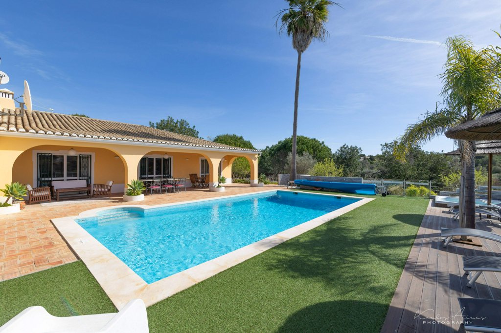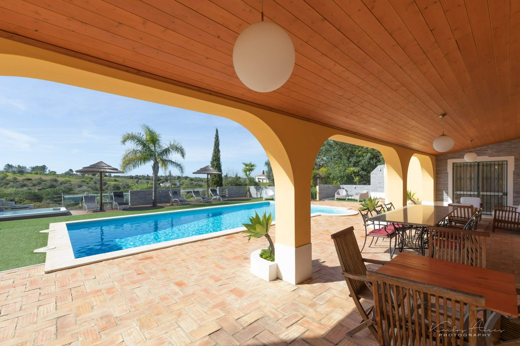 Fantastic 5-Bedroom Villa near Carvoeiro Beach is located in an exclusive development of substantial private villas. This single-storey villa mixes traditional Portuguese architecture with a modern interior. 5 minutes from five stunning beaches including the famous Praia da Marinha, and just minutes from the International Nobel school in Porches, the Dutch and the German schools. Large internal living areas flow into external terraces and pool area. The villa is perfect as a permanent home for a large family, ideal as a holiday home for two families or its use easily adapted to an upmarket B&B. Mature gardens enhanced by expansive country views.