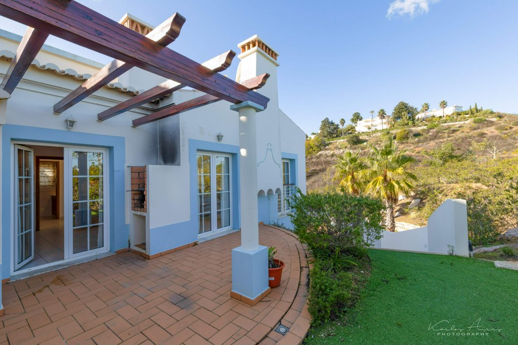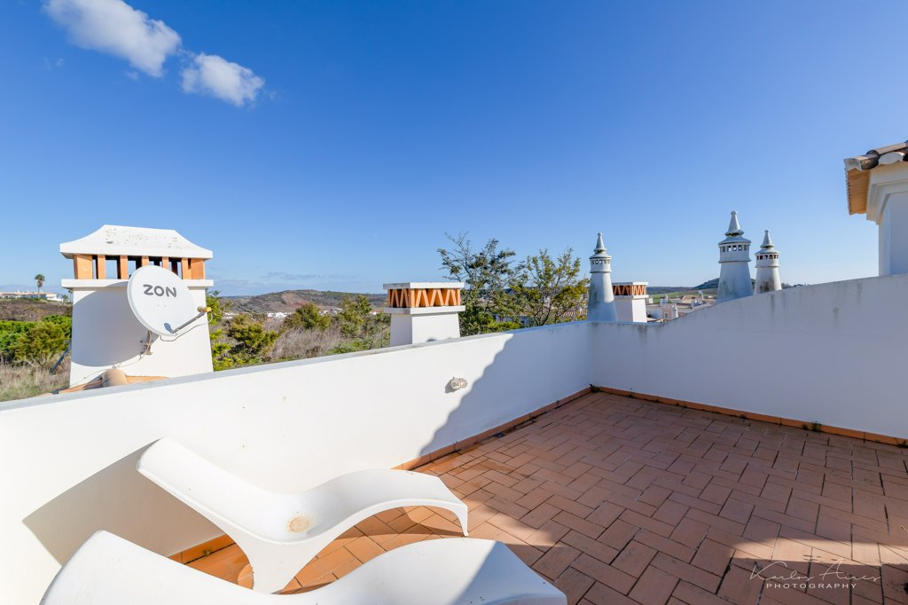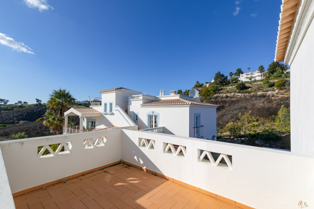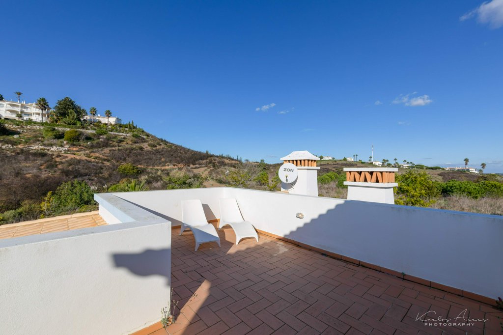 Stunning Western Algarve Golf Course Villa is a spacious property in an upmarket location, yet minutes from a still-traditional village and from the beautiful beach of Salema. Situated in the Santo António golf resort, the villa is well positioned within the complex in a privileged corner location. On the first floor a wide living room with doors leading to the balcony with stunning views to the golf course. The living room has a fireplace as well as cable TV and wireless internet. A fully equipped kitchen with door leading to a paved patio and a serviced bathroom. There is a roof top terrace with 360 views up the stairs from the living room.