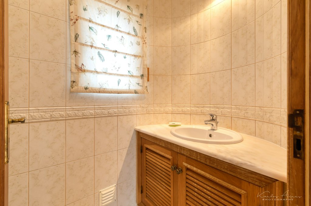 On the ground floor level is the master bedroom with ample wardrobe space and an ensuite bathroom and 2 single bedrooms with fitted wardrobes and a shared bathroom. All bedroom have access to the large terrace and pool. AC installed throughout with dual function (cooling and heating).